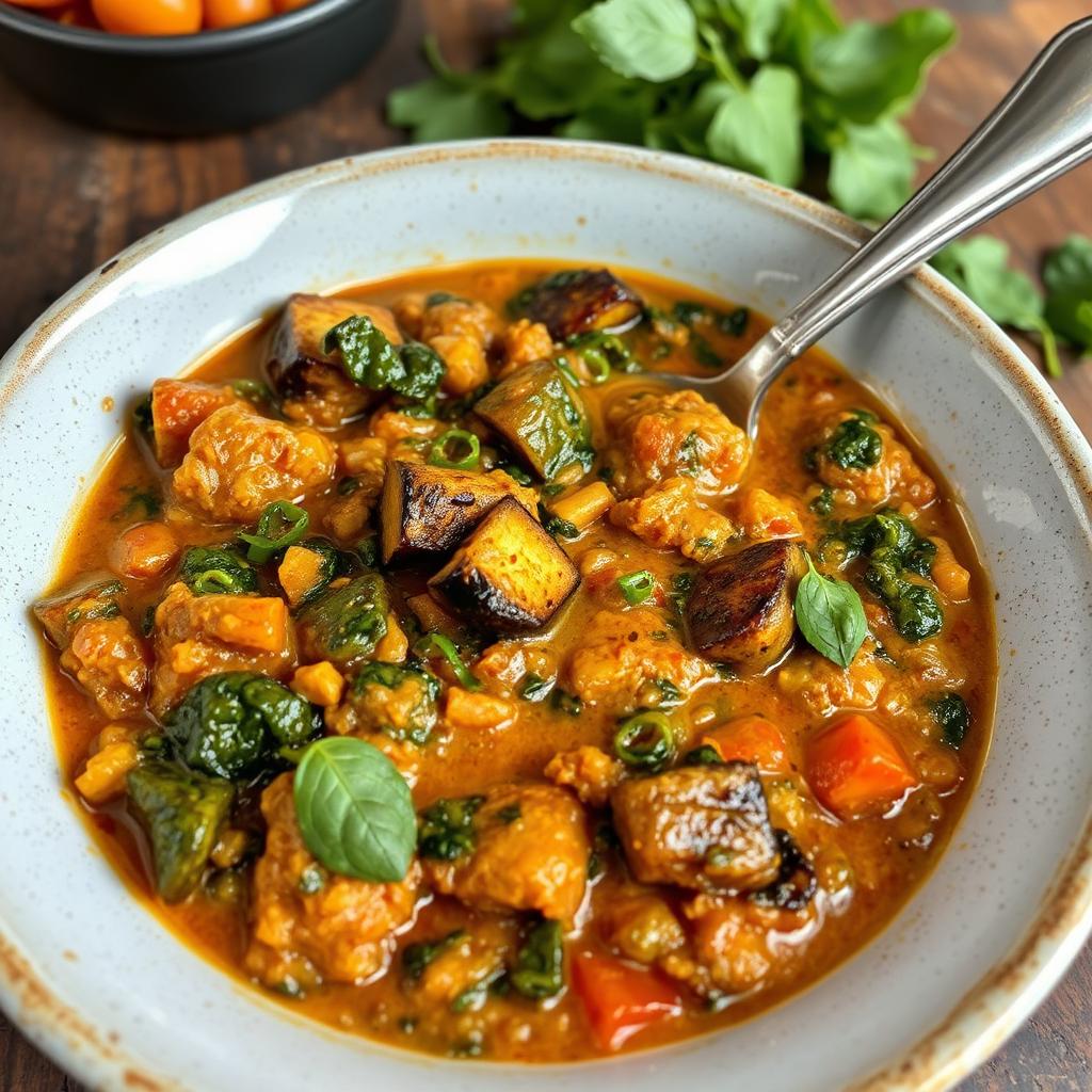 Discover the rich, comforting flavours of Roasted Aubergine and Spinach Dhal!