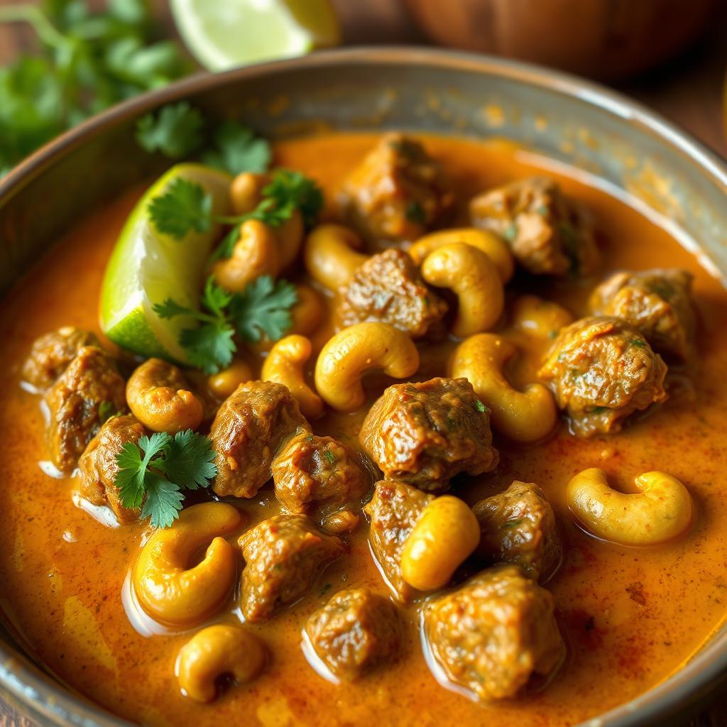 - Preheat the oven to 160°C, fan 140°C, gas 3. Place the cashews on a baking tray and toast in the oven for 12-14 minutes until light golden brown, then set aside. Meanwhile, heat 1 tablespoon of the oil in a large non-stick casserole or deep lidded frying pan. Season the beef and brown in batches over a high heat, adding a further 1 tablespoon oil as necessary. Set aside in a bowl as each batch is browned.