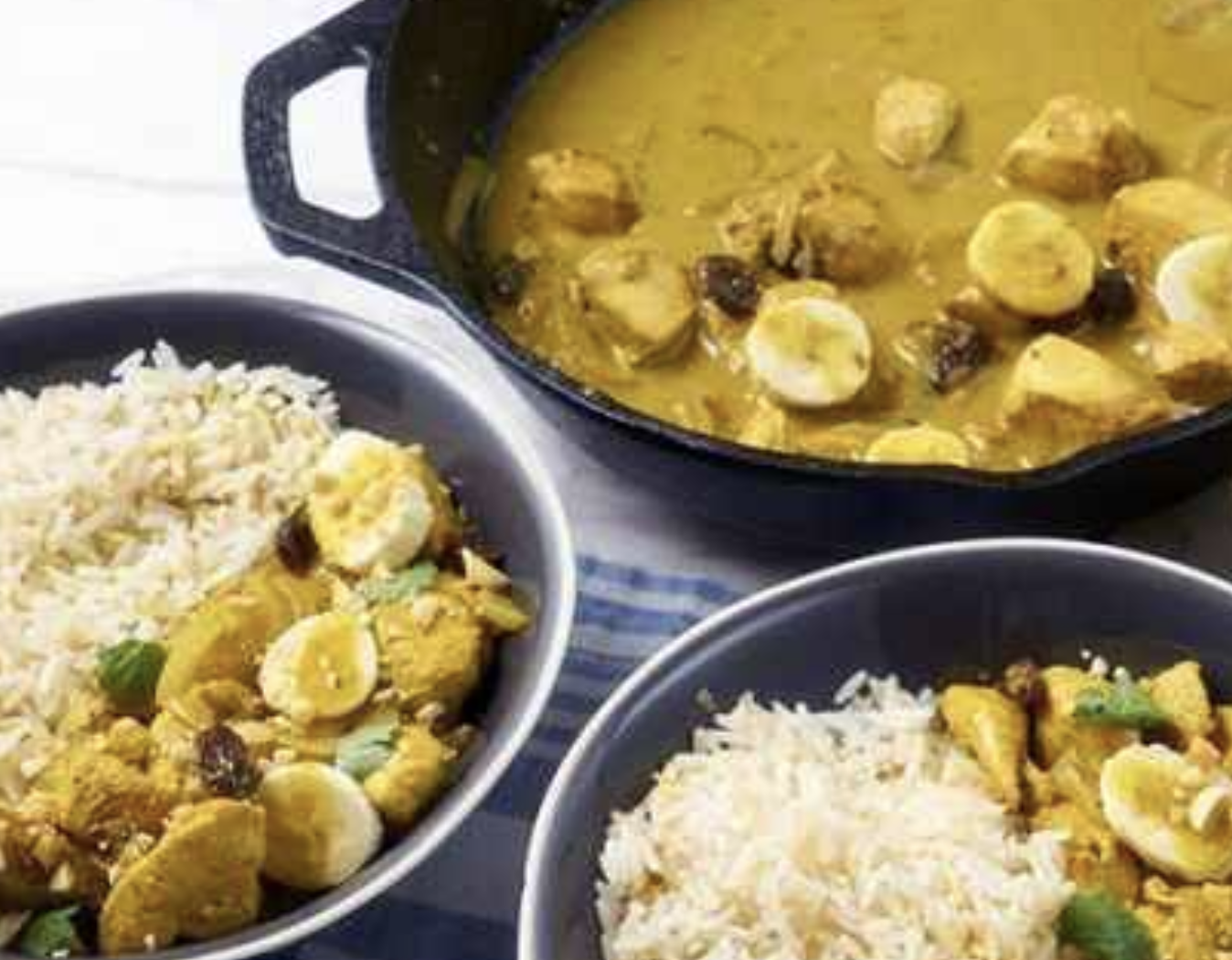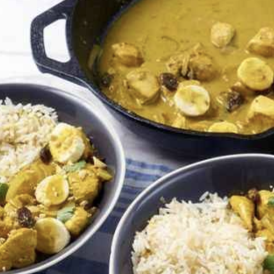- Pour in the chopped tomatoes and let the mixture simmer for 10 minutes. Then add the coconut milk and half the bananas to the curry. Bring to the boil, and cook with the lid off for 15-20 minutes until the sauce has thickened and the chicken is cooked through.