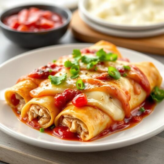 5. To assemble, spoon a bit of the sauce on to the bottom of a baking dish – make sure the dish is around 20x30cm to fit the enchiladas in. Spoon a little of the chicken mixture down the centre of each tortilla, roll up and put in the baking dish. Repeat with all the tortillas and filling, placing them side by side so they don’t unravel. Pour the remaining sauce over the top, then scatter over the Cheddar and remaining mozzarella. Bake in the oven for 20-25 mins until the cheese has melted and started to brown.