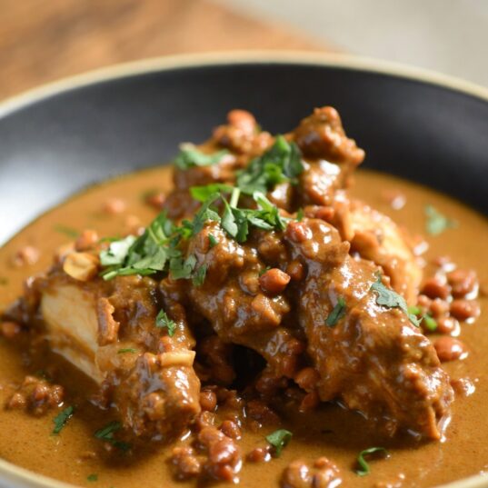 6. Continue to simmer for 40 minutes stirring often. Check to see if the chicken is cooked all the way through. Turn off the heat, add the lime juice and check seasoning. Leave to rest for 10 minutes. Scatter over the sliced chilli, spring onions, fresh coriander and rest of the peanuts. Serve with Shemin’s Indian Breads