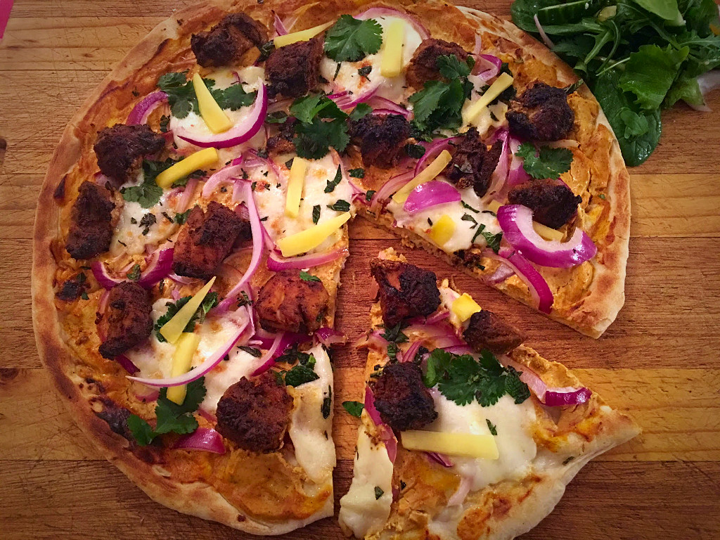 Tender chunks of tandoori chicken, crispy red onion, sweet mango, fresh mint and coriander, creamy yoghurt and delicious mozzarella melted together on naan bread. Heaven on a plate! Eat for lunch or dinner or if you’re like us, both!