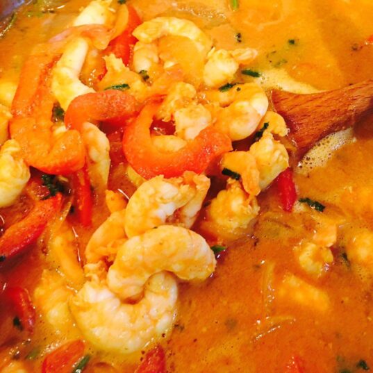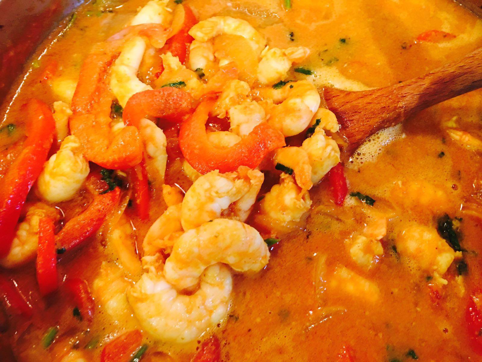 5 – Stir in 200ml of coconut milk, then add 800g of raw prawns and cook until the prawns are pink and cooked through. About 4-5 minutes.
