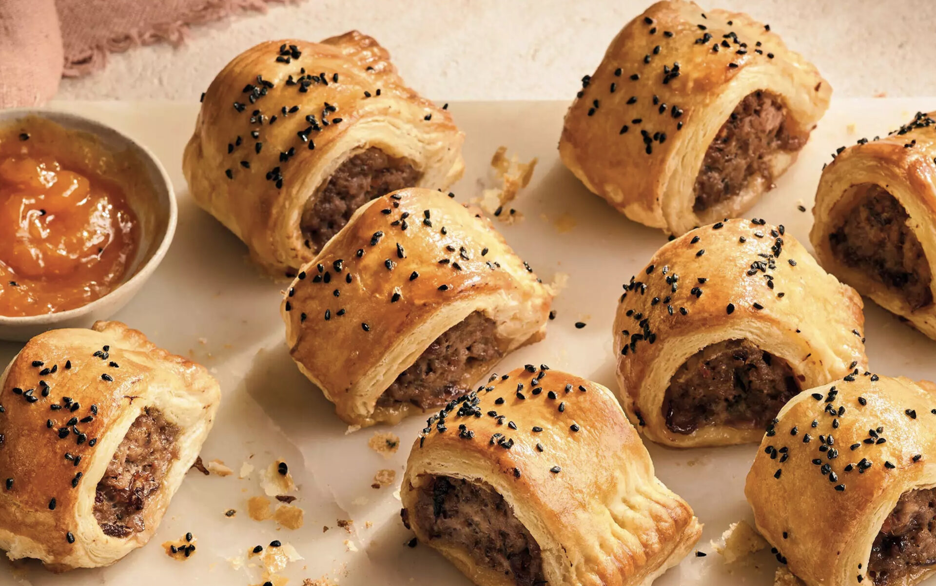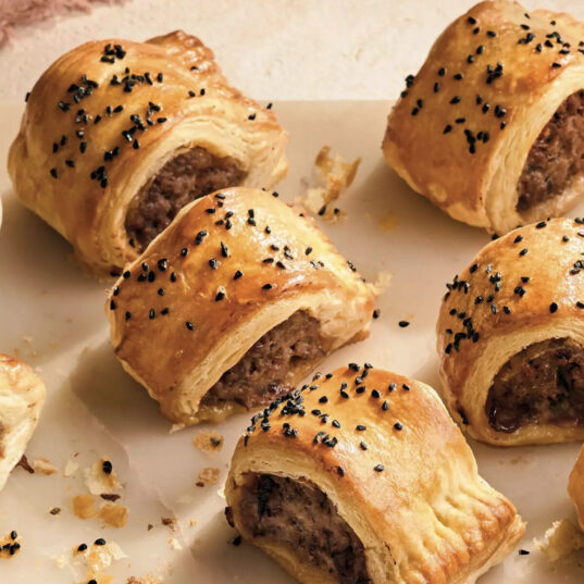 - Glaze the pastry all over with more beaten egg. Chill for at least 30 minutes until firm. Meanwhile, preheat the oven to 210°C, gas mark 7. Slice each roll into 8 (to make 16). Put on a baking tray, glaze with more egg and sprinkle with nigella seeds. Bake for 20-25 minutes, or until the pastry is cooked through and the filling is piping hot with no pink meat. Serve with Shemin’s Mango Chutney.