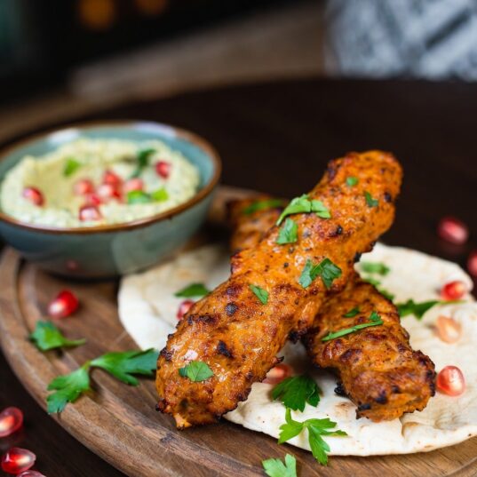 These super-tender and succulent low-carb kebabs are served hot a cold, fresh dip. The flavour of the dip is improved if you can prepare it the day before and chill it in the fridge overnight to allow the flavours to intensify.