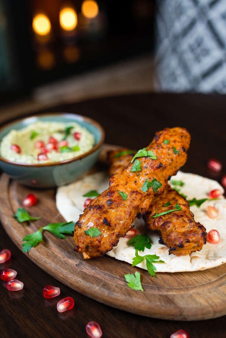 6. Serve the kebabs with the smashed aubergine dip and a green salad then wrap it in a Shemin’s Indian Bread.