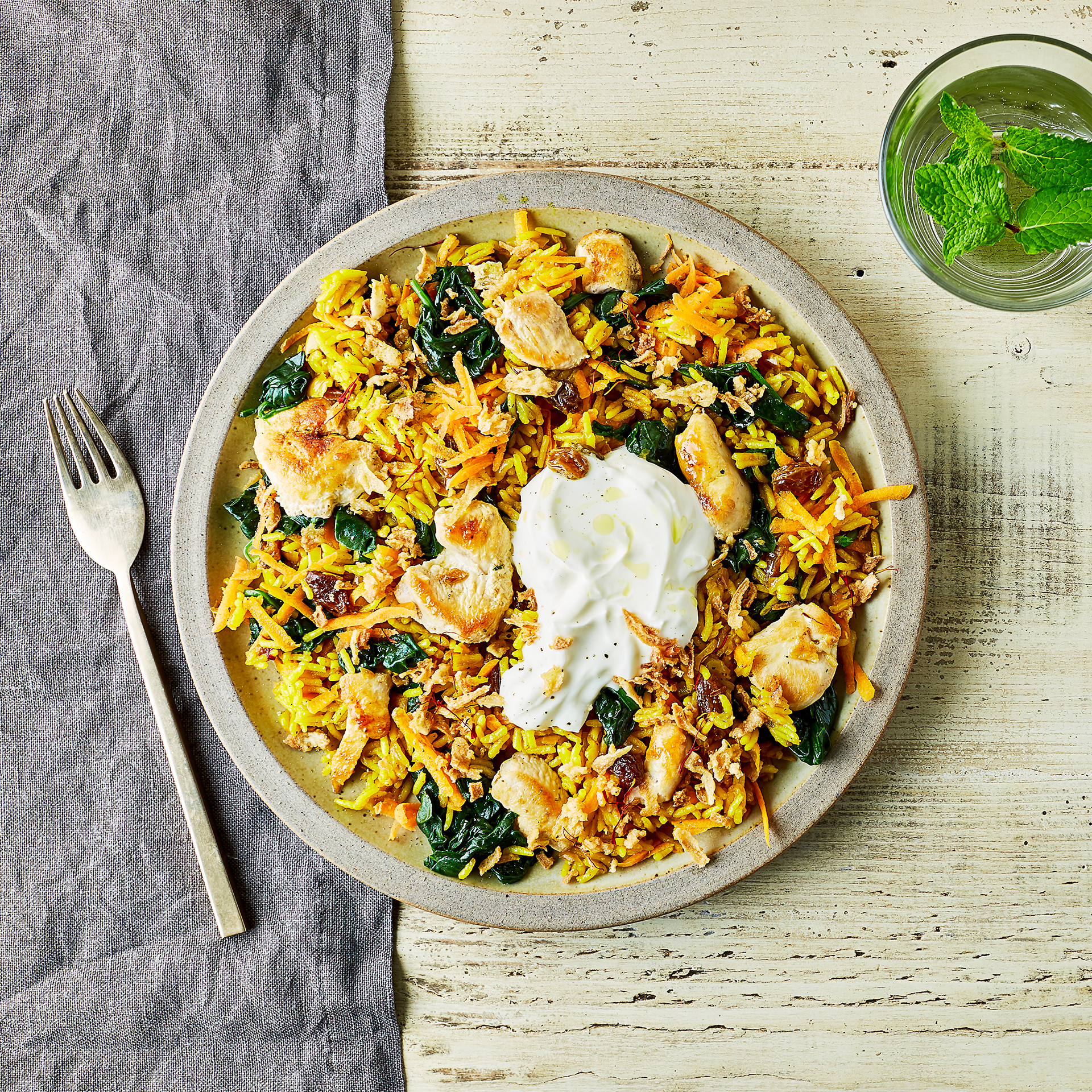 - In a small bowl, mix the yoghurt with the lemon zest and juice, season and set aside. Remove the lid, fluff up the rice with a fork, top with a few spoonfuls of yoghurt and scatter over the sultanas. Serve the pilaf with the remaining yoghurt and lemon wedges to squeeze over.