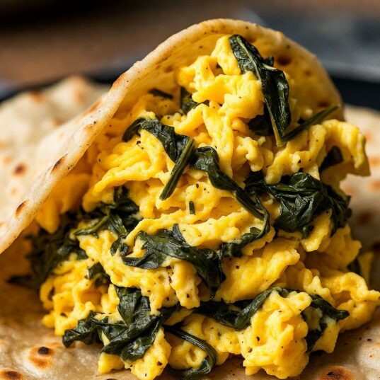 - Beat the eggs in a bowl, then pour into the pan. Turn the heat down low and stir gently until just cooked. Remove from heat while still slightly soft – they’ll finish cooking in the wrap. Season with salt, Shemin’s Chaat Masala (to taste), and chilli flakes (to taste).