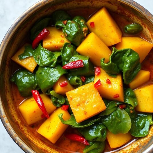 3. Finally, add the semi-crushed boiled potatoes and stir in a bag of fresh spinach. Check the seasoning and add lime.