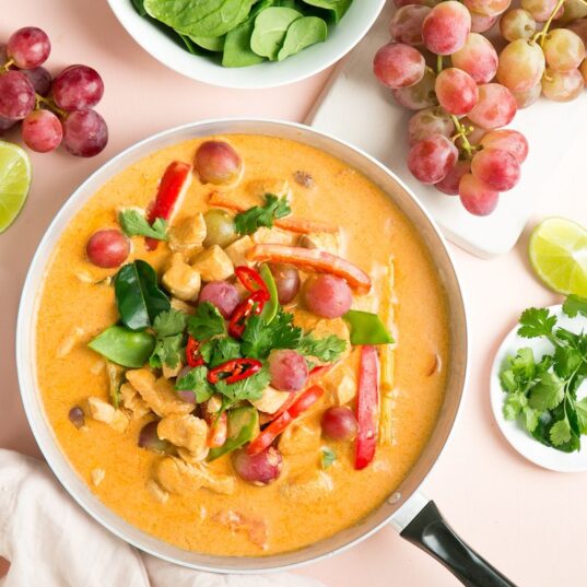 Discover the unexpected magic of grapes in a curry with this sweet and creamy Chicken and Grape Curry. The addition of grapes adds a burst of natural sweetness that balances beautifully with the rich coconut milk and works very well with our Chilli Free Curry Paste.